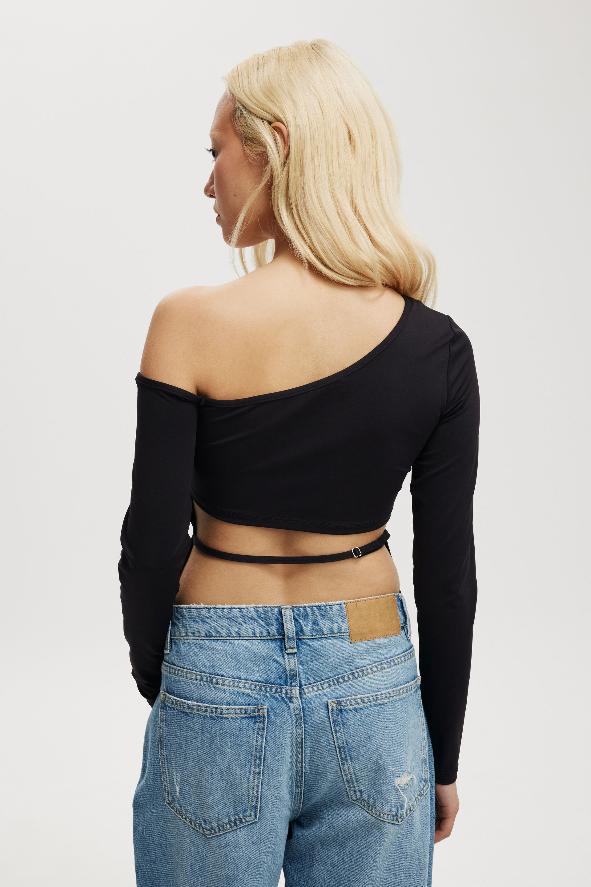 Asymmetrical Off The Shoulder Long Sleeve Top - Backless Top with Sliders - Smooth Fabrication -