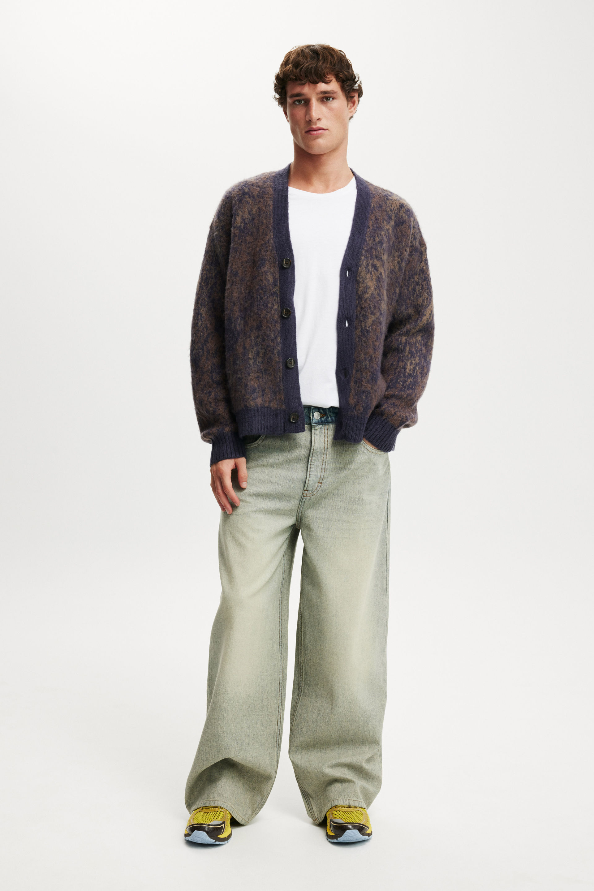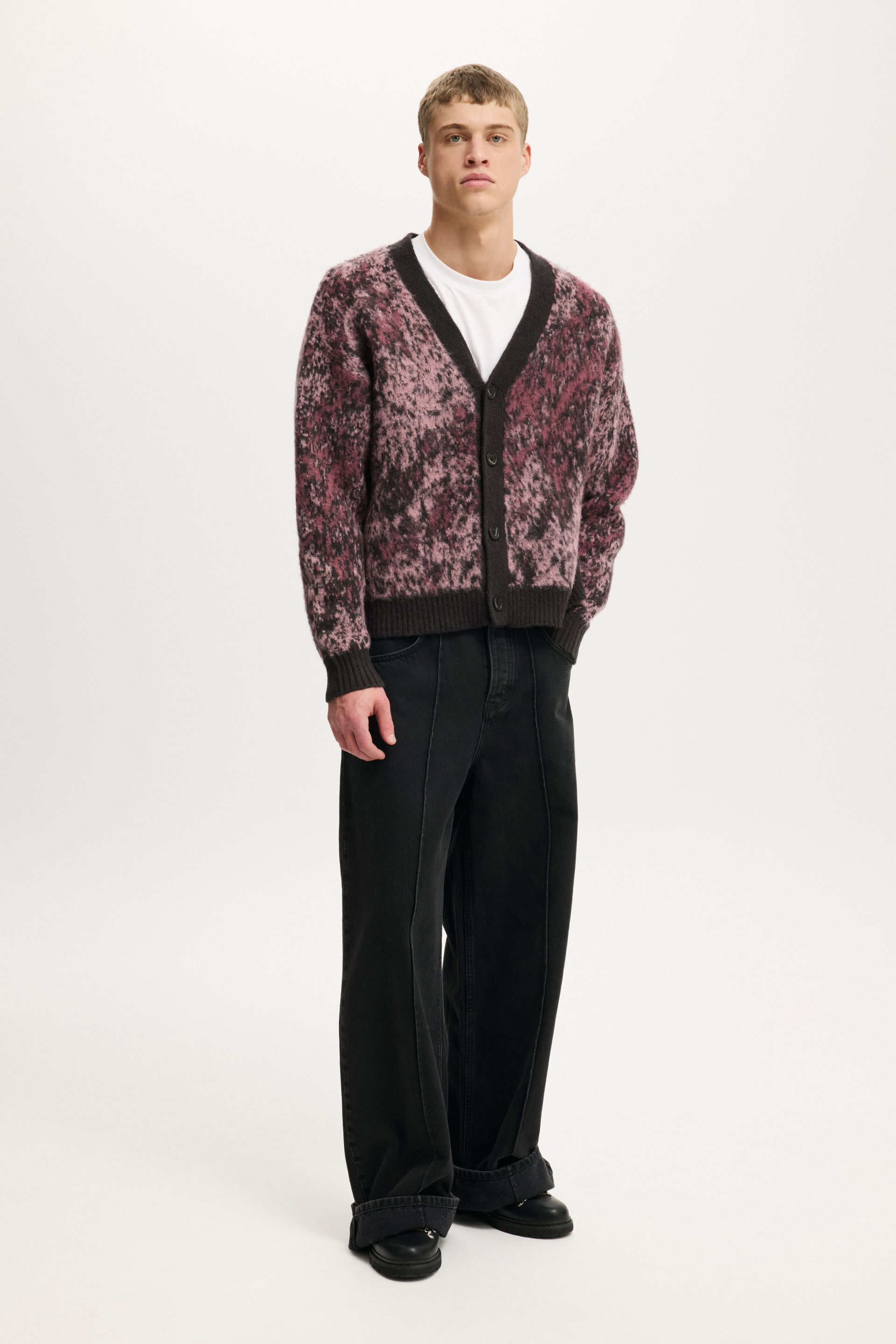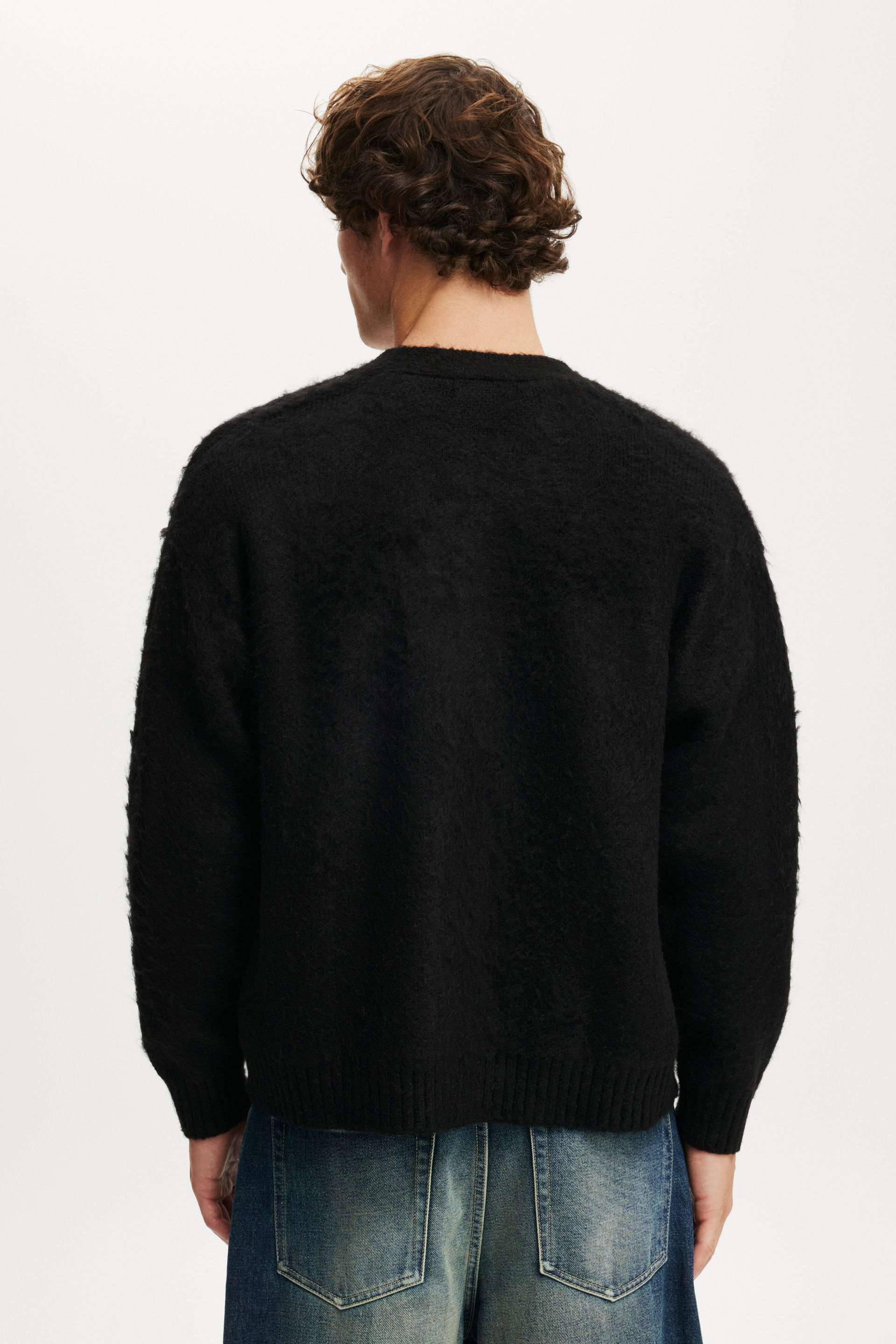 A cozy essential with an edge. This boxy cropped cardigan is crafted from soft fluffy yarn for maximum comfort and standout texture. Designed with a relaxed fit and clean lines, it brings a fresh silhouette to layeringโ€”perfect for throwing on over a tee or styling up with baggy denim.
