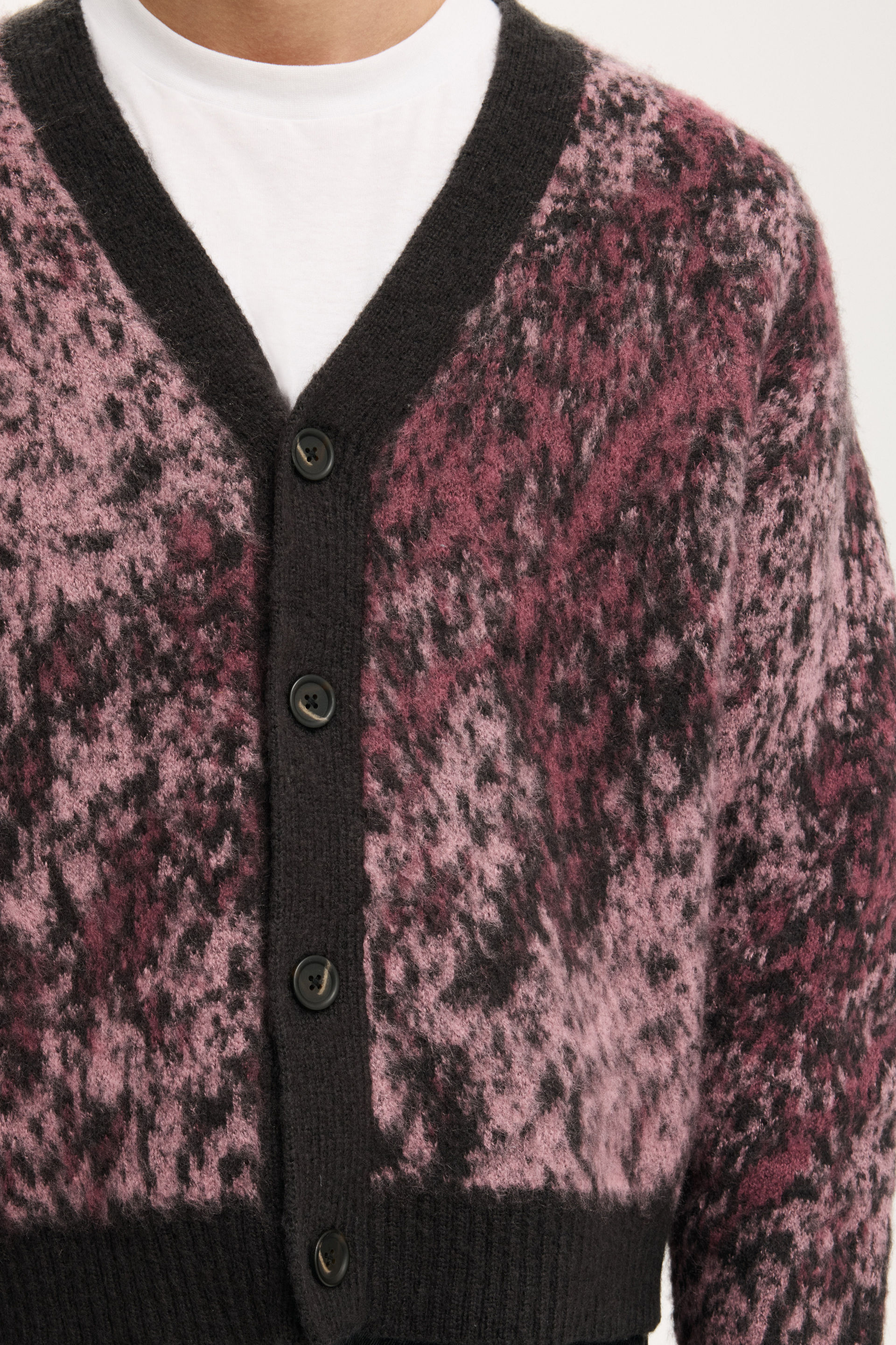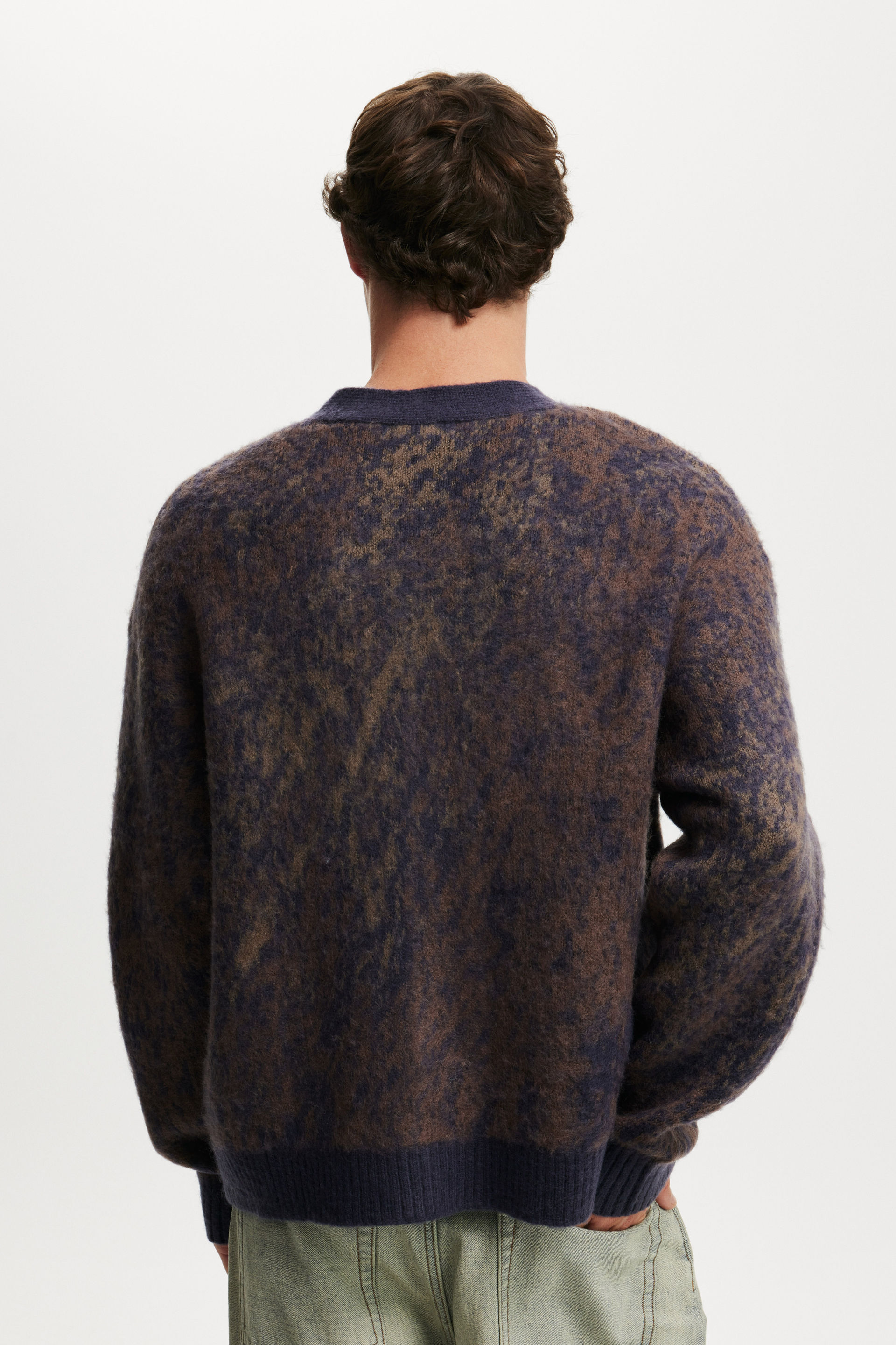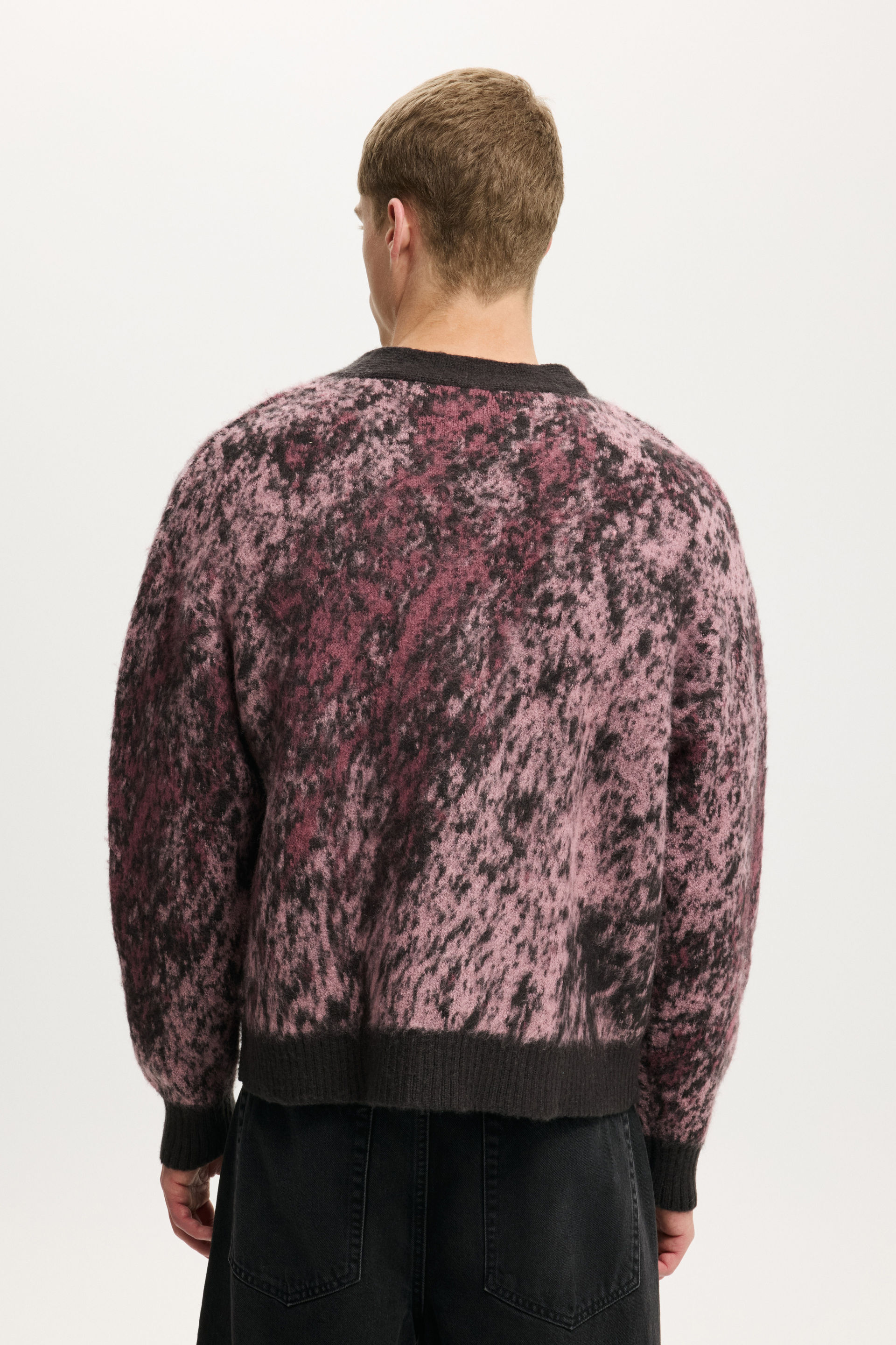 A cozy essential with an edge. This boxy cropped cardigan is crafted from soft fluffy yarn for maximum comfort and standout texture. Designed with a relaxed fit and clean lines, it brings a fresh silhouette to layeringโ€”perfect for throwing on over a tee or styling up with baggy denim.