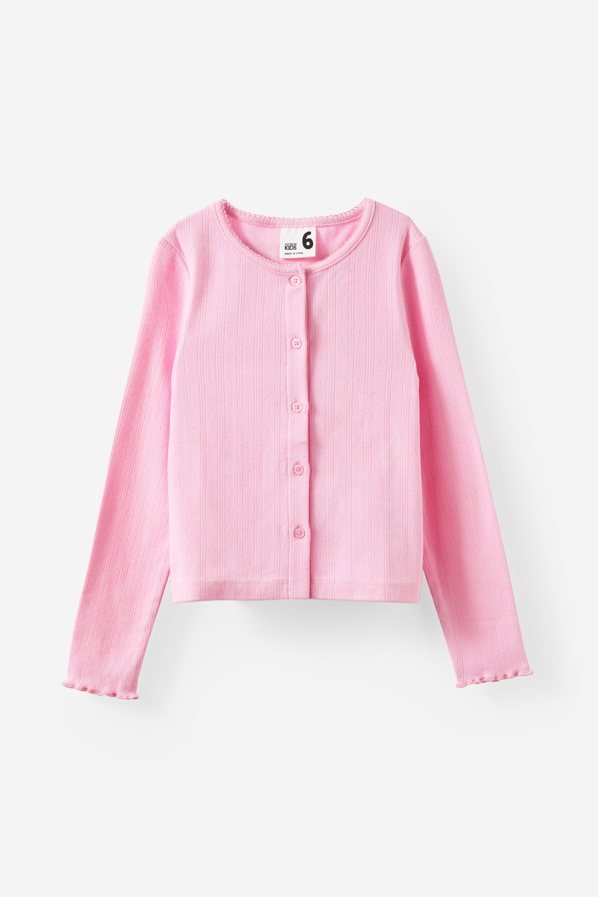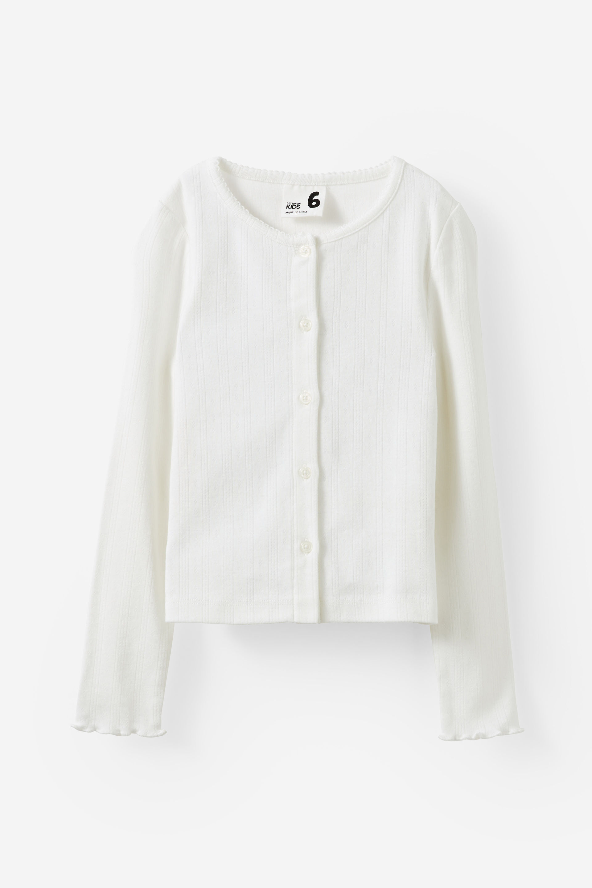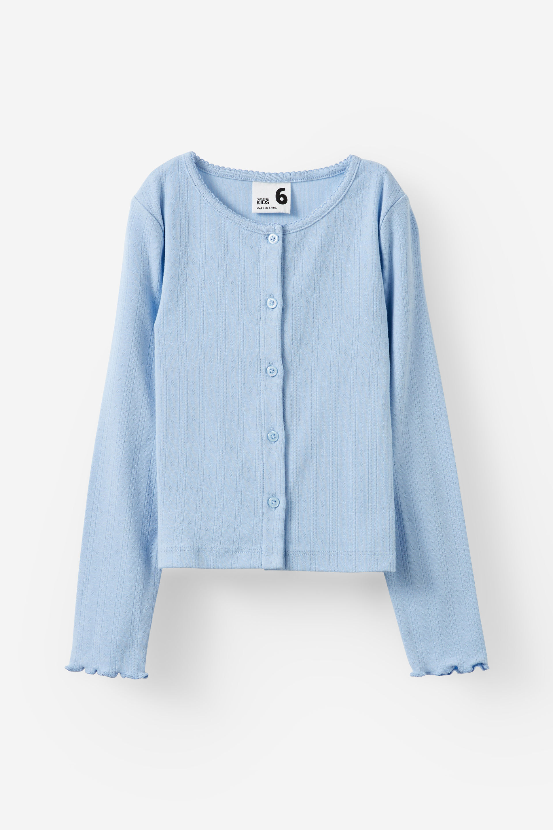 An easy essential, just elevated. The sweetest button-up top they've ever met. Featuring a delicate pointelle pattern and lettuce hem wrists, the cuteness is in the details. Made with soft lightweight cotton that won't hold them back. Let them wear it buttoned-up as a cosy top or unbuttoned for a cardigan moment. The options are endless. Whatever the weather, this long-sleeve top does it all.
