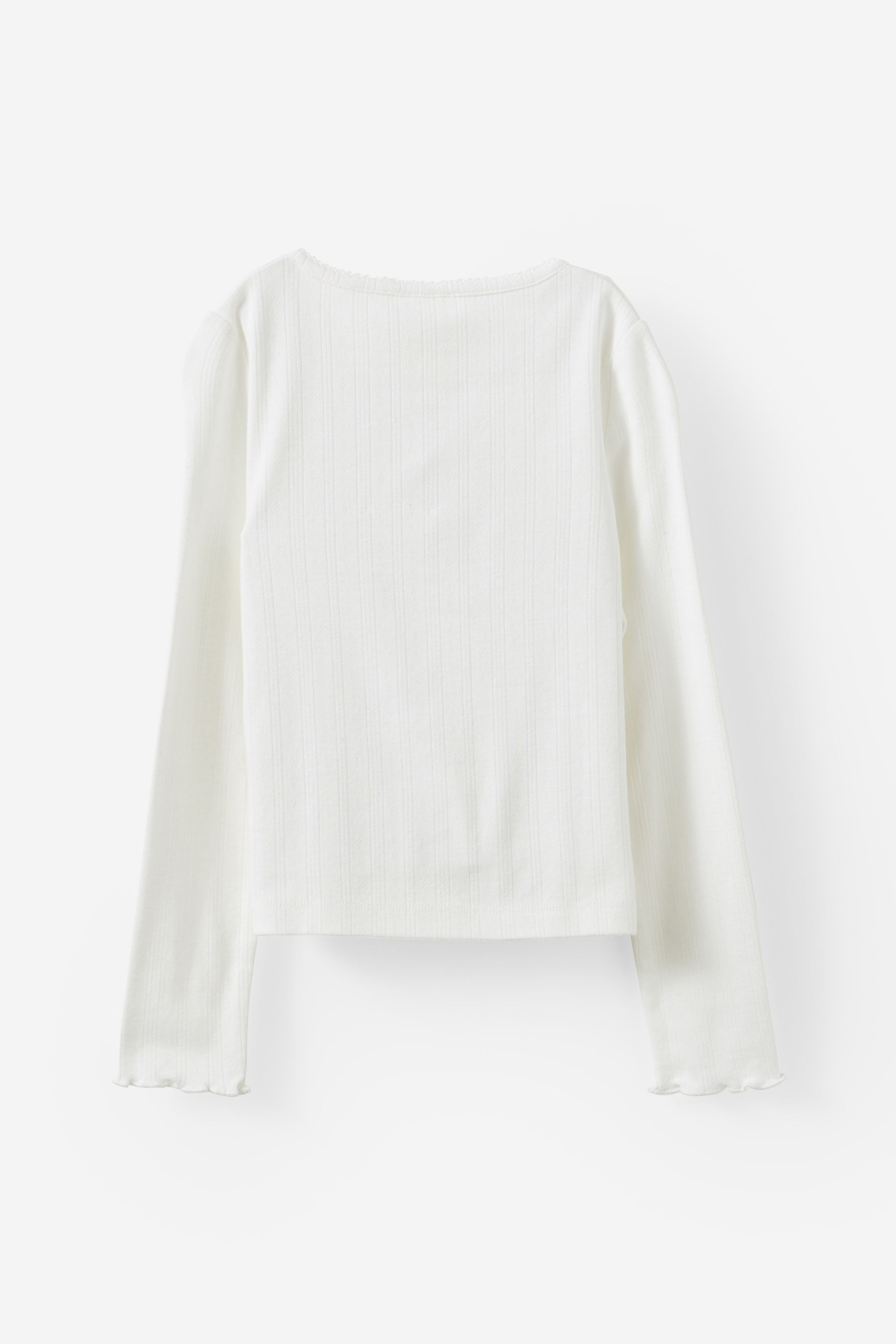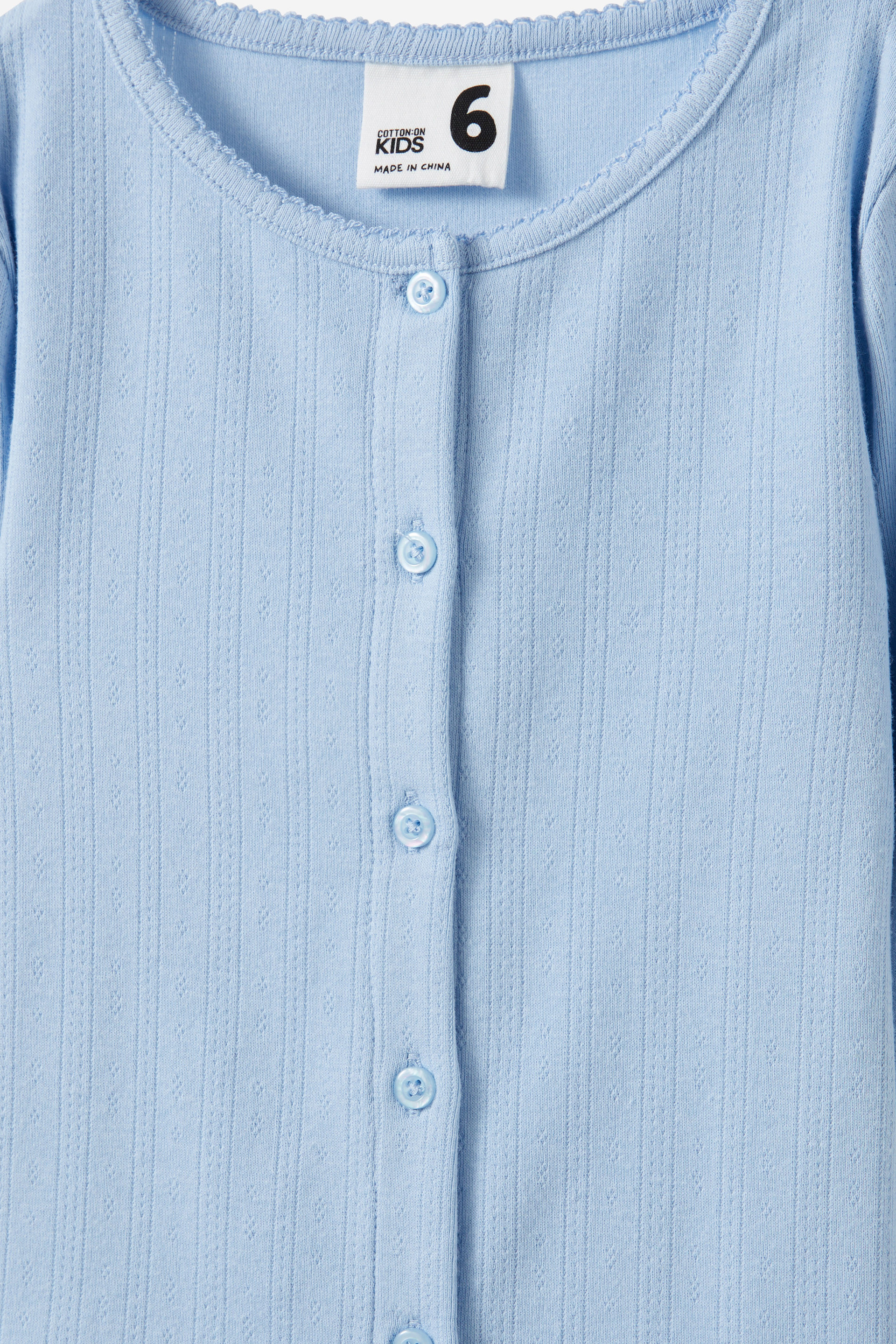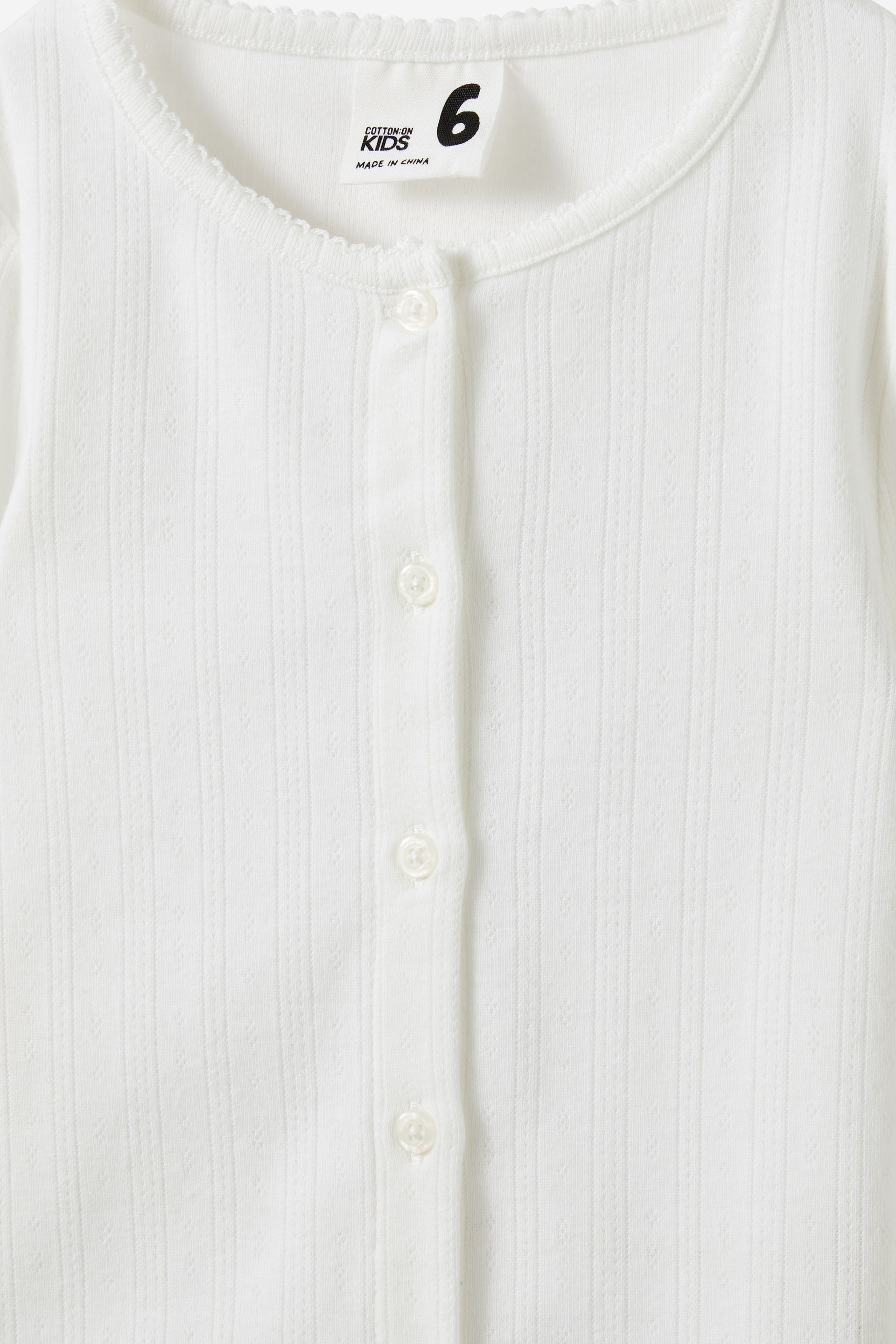 An easy essential, just elevated. The sweetest button-up top they've ever met. Featuring a delicate pointelle pattern and lettuce hem wrists, the cuteness is in the details. Made with soft lightweight cotton that won't hold them back. Let them wear it buttoned-up as a cosy top or unbuttoned for a cardigan moment. The options are endless. Whatever the weather, this long-sleeve top does it all.
